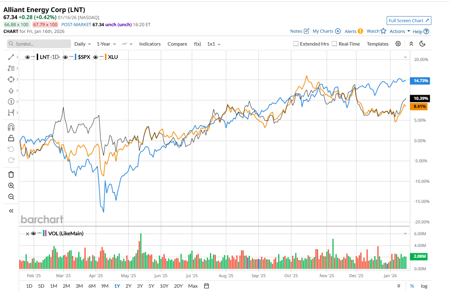 LNT has gained 12.1% over the past 52 weeks, lagging behind the S&P 500 Index's ($SPX) 16.9% return over the same time frame. However, zooming in further, it has outpaced the State Street Utilities Select Sector SPDR ETF’s (XLU) 10.2% uptick over the same time period.